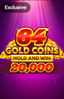A classic-style slot game offering a chance to collect 64 gold coins. The “Hold and Win” feature suggests a bonus mechanic where players can hold certain symbols to increase their winnings, aiming for a jackpot of 20,000 coins.